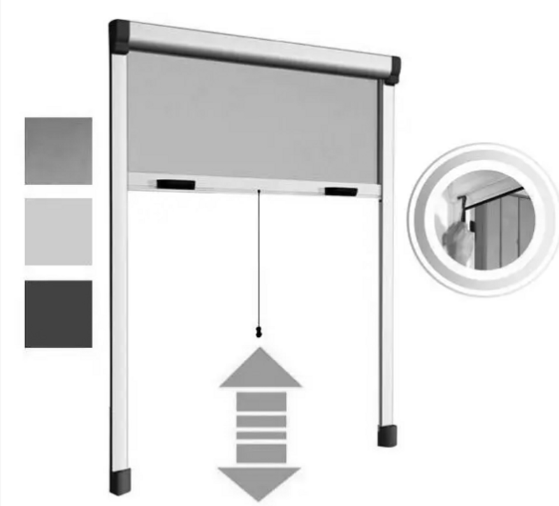 h 250 cm 100/ 80 Avvolgimento automatico con frizione Telaio e coprirullo alluminio Maniglie inferiori bloccaggio/sbloccaggio Rete fibra vetro Profondita' cassonetto mm 45 Montaggio a pressione senza utilizzo di viti